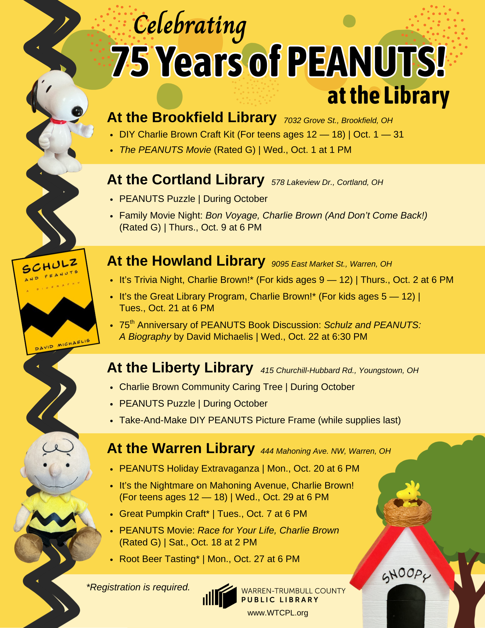 The Warren-Trumbull County Public Library is celebrating the 75th anniversary of the beloved PEANUTS comic strip this October. Check out a book or movie to learn more about the history of the comic strip, its creator, and its lasting influence. A variety of library special events themed around Charlie Brown, Snoopy, and the PEANUTS gang is planned throughout the month. |