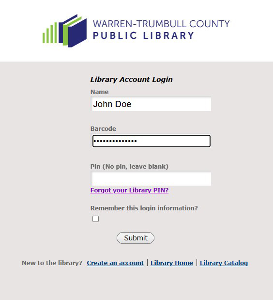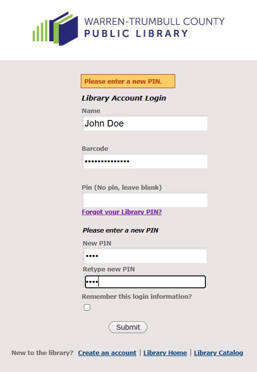 You should see a screen that looks something like the picture below. Enter your name and your library barcode. Since you don’t have a PIN yet, leave the Pin field blank. Press the submit button.